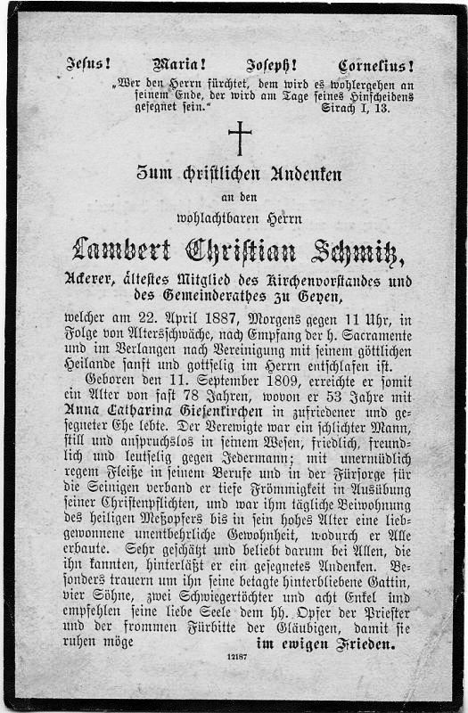 | Ackerer; ältestes Mitgl. des Kirchenvorstandes u. d. Gemeinderates zu Geyen; 53 J. verh. mit Anna Catharina Giesenkirchen; 4 überlebende Söhne |