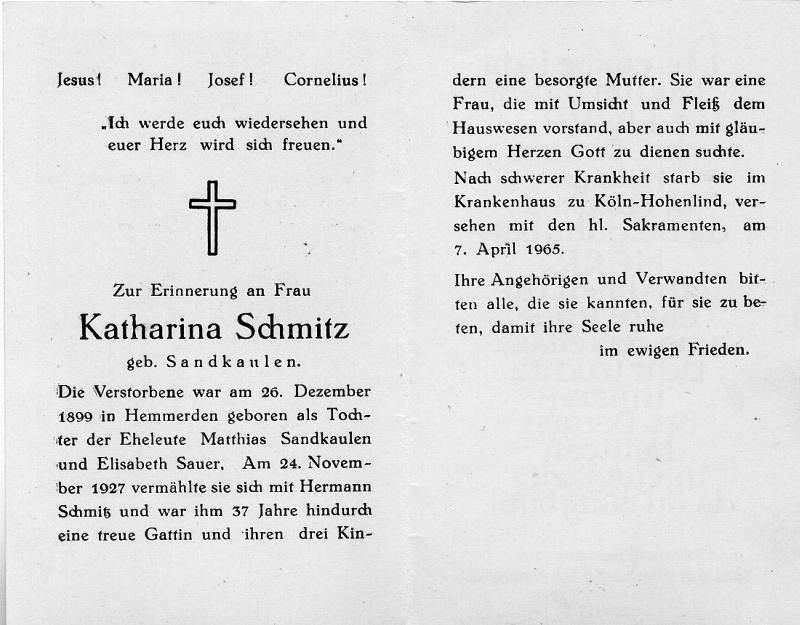 | Eltern: Matthias Sandkaulen u. Elisabeth geb. Sauer; ∞ 24.11.1927 Hermann Schmitz; 3 K. |