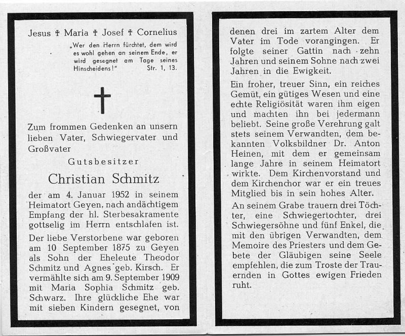 | Gutsbesitzer; Eltern: Theodor Schmitz und Agnes geb. Kirsch; ∞ 9.9.1909 Maria Sophia Schwarz, vor 10 J. † ; 7 K., davon 3 früh †; verwandt mit dem Volksbildner Dr. Anton Heinen; Mitgl. Kirchenvorst. u. Kirchenchor |