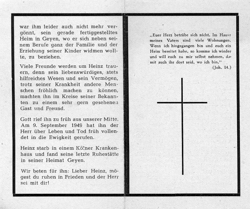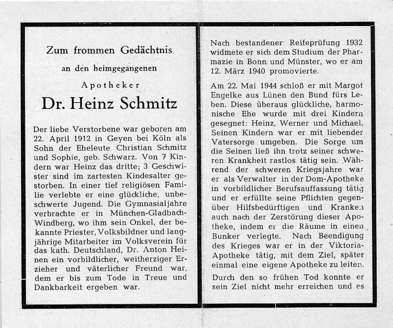 | Apotheker; Eltern: Christian Schmitz u. Sophie geb. Schwarz; sein Onkel: Priester u. Volksbildner (Volksverein für das kath. Deutschland) Dr. Anton Heinen; ∞ 22.5.1944 Margot Engelke aus Lünen; 3 K.: Heinz, Werner, Michael; Dom-Apotheke, Viktorian-Apotheke (Köln?); gerade fertiggestelltes Heim in Geyen; Friedhof Geyen |