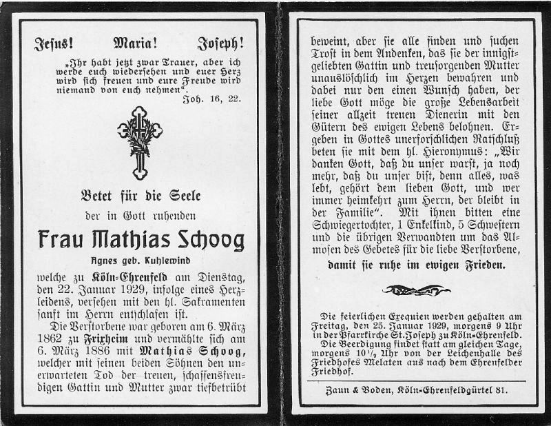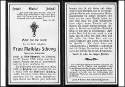 | Herzleiden; ∞ 6.3.1886 Mathias Sch∞g; 2 Söhne |