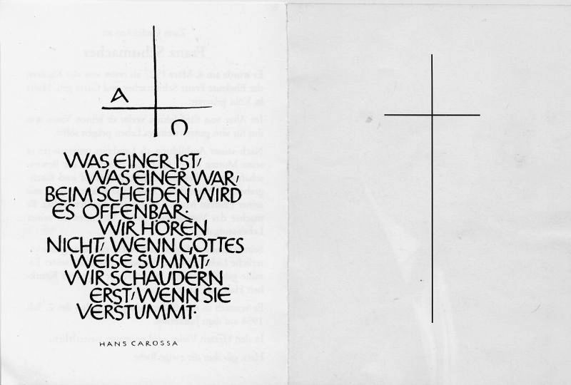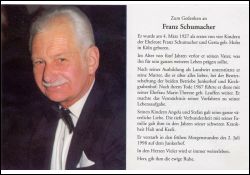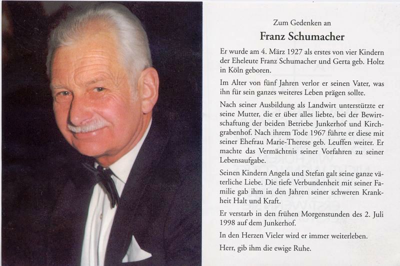 | Eltern: Franz Schumacher u. Gerta geb. Holtz; Vater früh verloren; Ausbildung als Landwirt; unterstützte seine Mutter bei d. Bewirtschaftung v. Junkerhof u. Kirchgrabenhof; n. deren Tod 1967 führte er diese mit Ehefrau Marie-Therese geb. Leuffen weiter; 2 K.: Angela u. Stefan |