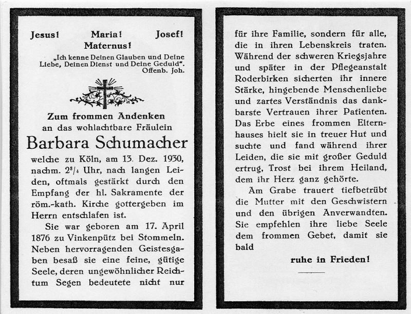 | Fräulein; langes Leiden; in der Pflegeanstalt Roderbirken tätig |