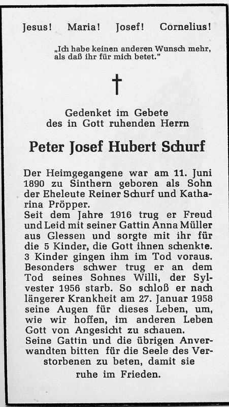| Eltern: Reiner Schurf u. Katharina geb. Pröpper; ∞ 1916 Anna Müller aus Glessen; 5 K., davon 3 †; besonders schwer trug er am Tod des Sohnes Willi, † 1.1.1956; längere Krankheit (Geyen) |