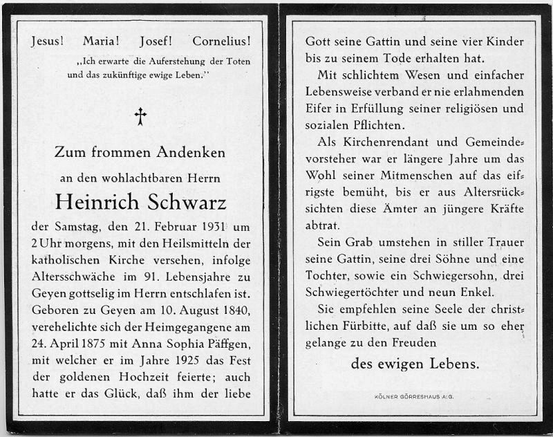 ∞ 24.4.1875 Anna Sophia Päffgen; 1925 Goldhochzeit; 4 K.; Kirchenrendant u. Gemeindevorsteher in Geyen; |