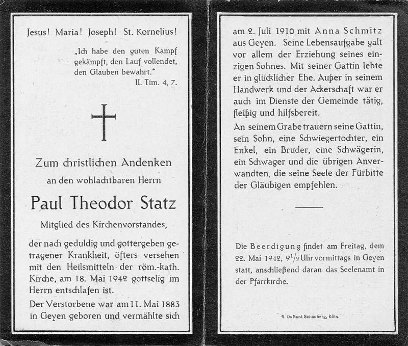 | Mitgl. d. Kirchenvorstandes in Geyen; ∞ 2.7.1910 Anna Schmitz aus Geyen; 1 Sohn; Handwerk und Ackerschaft |