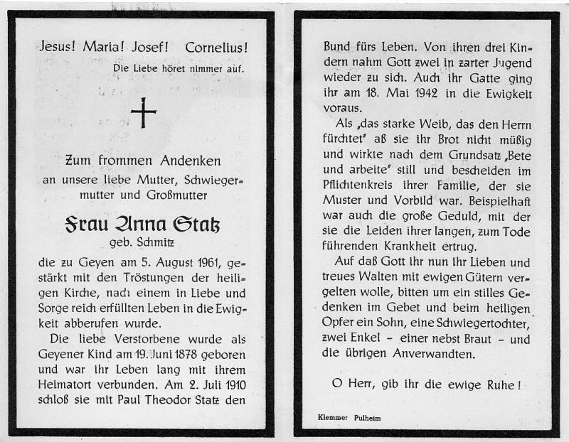 | ∞ 2.7.1910 Paul Theodor Statz, † 18.5.1942; 3 K., davon 2 †; langes Leiden |