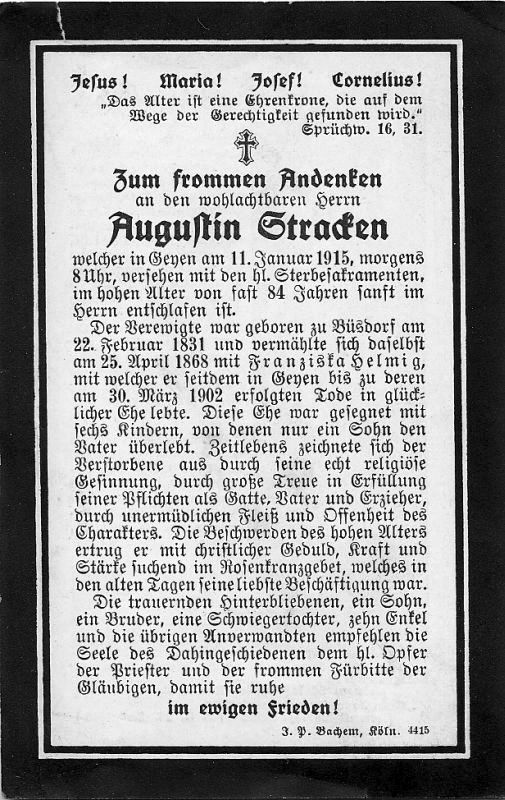 | ∞ 25.4.1868 in Büsdorf Franziska Helmig, † 30.3.1902; seit Hochzeit in Geyen; 6 K., davon 5 †; |