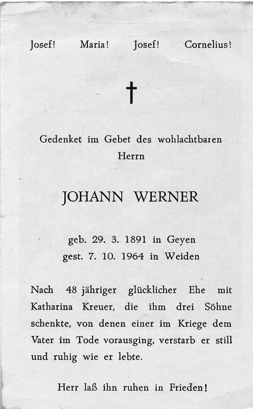 | 48 J. verh. mit Katharina Kreuer; 3 Söhne, davon 1 im 2. Weltkrieg gefallen |