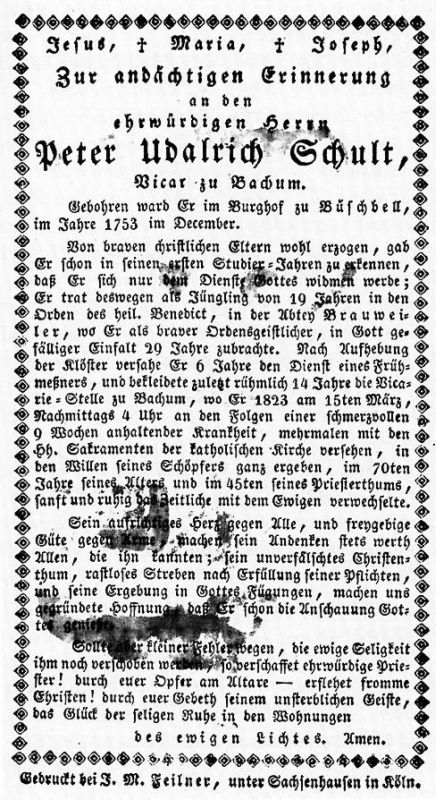 70 J.; 45 J. Priester; mit 19 J. Eintritt in die Abtei Brauweiler, dort 29 J. als Ordensgeistlicher; nach der Säkularisation (1802) 6 J. Frühmessner, dann 14 J. Vikar in Bachem |