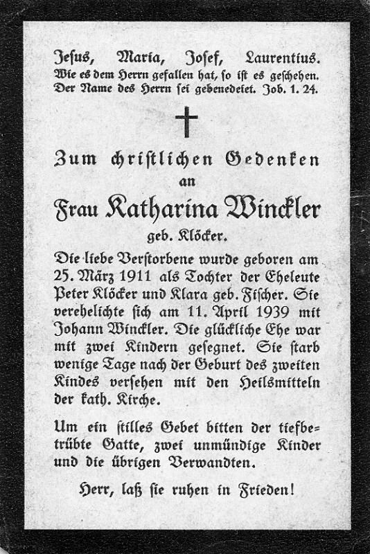 | Eltern: Peter Klöcker u. Klara geb. Fischer; ∞ 11.4.1939 Johann Winckler; 2 K.; starb wenige Tage nach der Geburt des 2. Kindes |