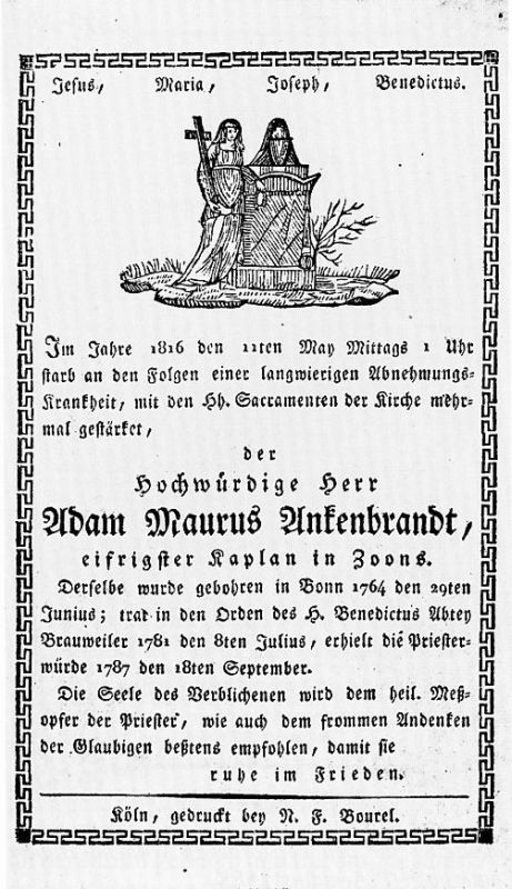 8.7.1781 Eintritt in den Orden des Hl. Benedikt in der Abtei Brauweiler; 18.9.1787 Priesterweihe; Kaplan in Zons |