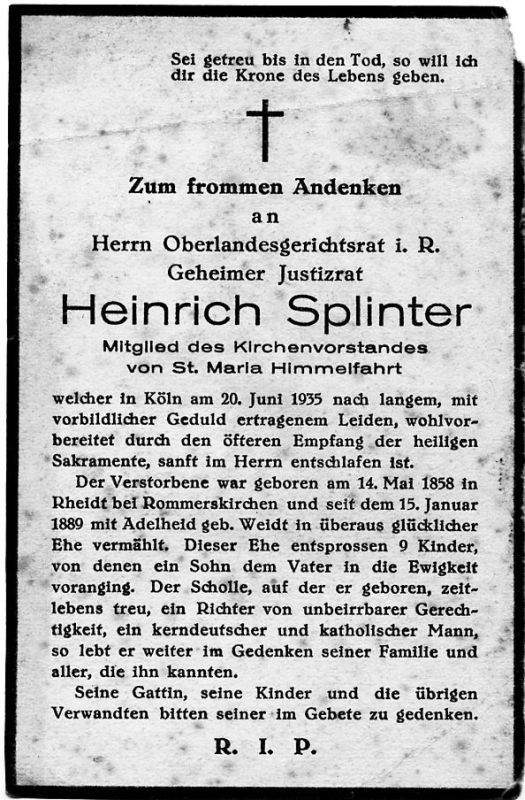 Oberlandesgerichtsrat i.R.; Geheimer Justizrat; Mitgl. des Kirchenvorstandes von St. Maria Himmelfahrt; ∞ 15.1.1889 Adelheid geb. Weidt; 9 Kinder, davon 1 Sohn verstorben |