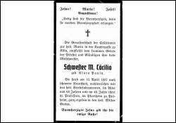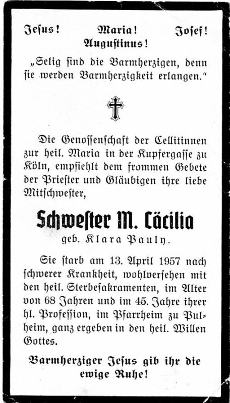 68 J.; 45 J. Schwester der Genossenschaft der Cellitinnen zur hl. Maria in der Kupfergasse; Schwesternname: M. Cäcilia |