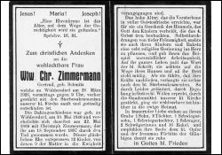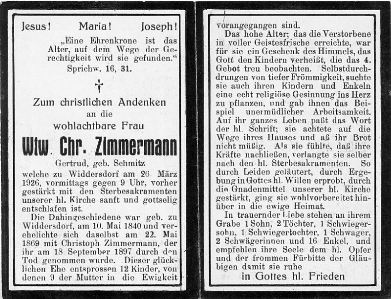 ∞ in Widdersdorf 22.5.1869 Christoph Zimmermann, † 18.9.1897; 12 K., davon 9 † |