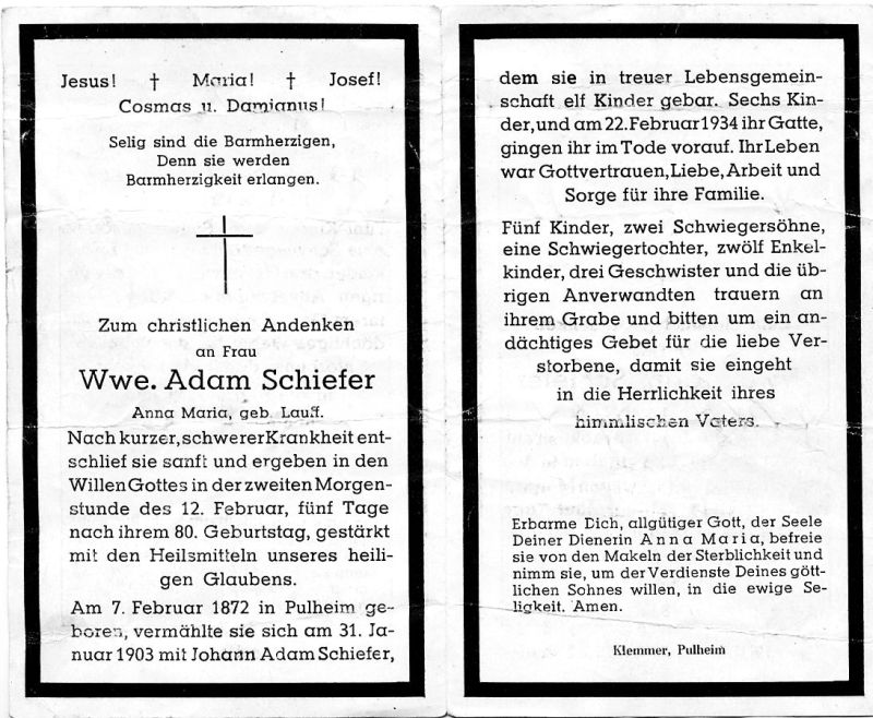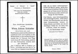 80 J.; ∞ 31.1.1903 Johann Adam Schiefer, † 22.2.1934; 11 K., davon 6 verstorben |
