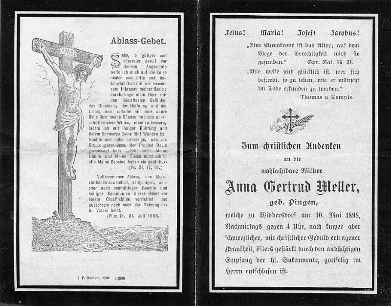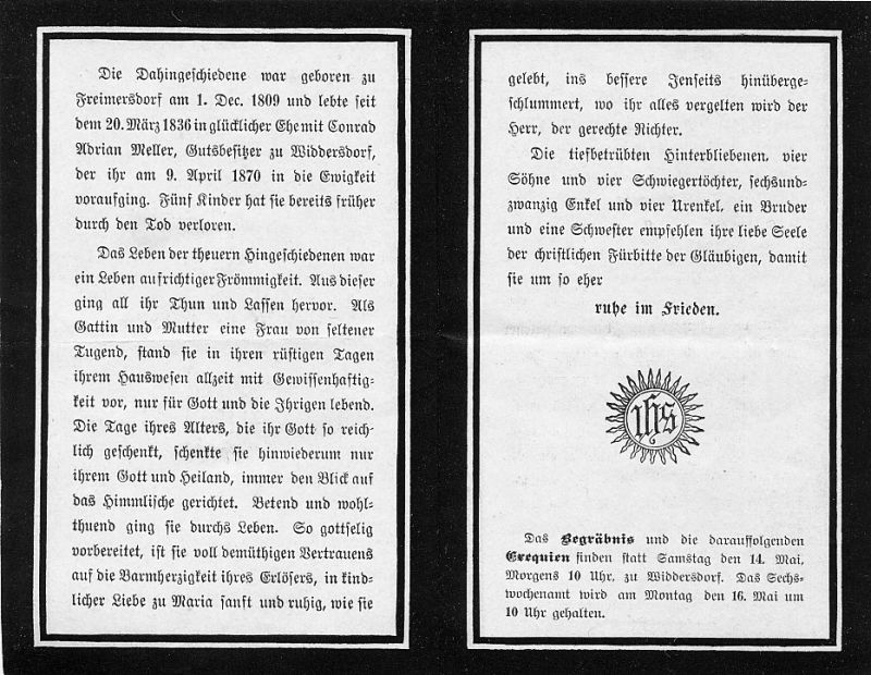 ∞ 20.3.1836 Conrad Adrian Meller, Gutsbesitzer zu Widdersdorf (Tönneshof), † 9.4.1870; 9 K., davon 5 †; |