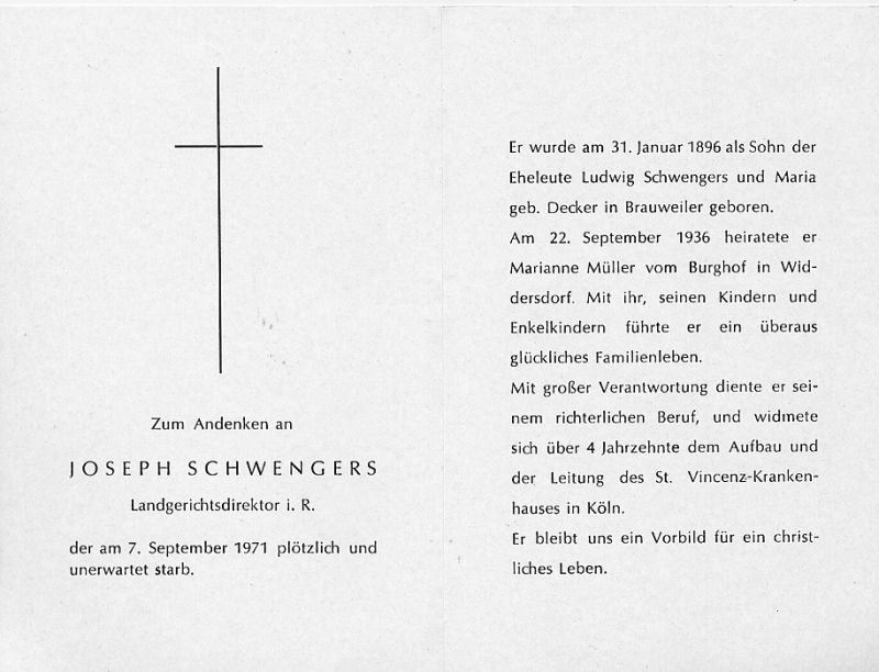 Landgerichtsdirektor i.R.; Eltern: Ludwig Schwengers u. Maria geb. Decker; ∞ 22.9.1936 Marianne Müller vom Burghof in Widdersdorf; Kinder; 4 Jahrzehnte Leitung des. St. Vincenz-Krankenhauses in Köln |