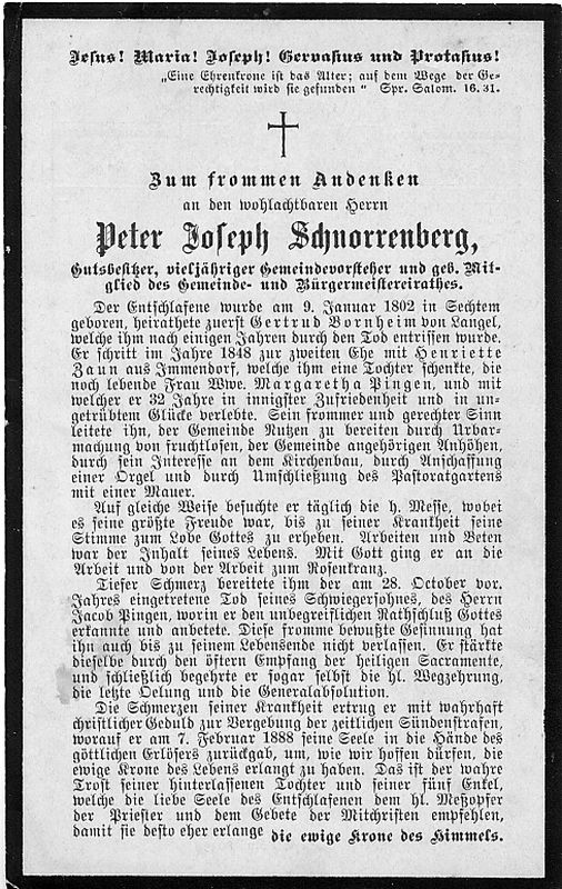 Gutsbesitzer; vieljähriger Gemeindevorsteher, geb. Mitgl. Gemeinde-/Bürgermeistereirat; ∞ Gertrud Bornheim aus Langel, nach wenigen J. †; ∞ 1848 Henriette Zaun aus Immendorf; 1 Tochter Margaretha (verh. Pingen); Verdienste um: Urbarmachung fruchtloser Anhöhen, Orgel, Ummauerung Pastoratgarten |