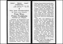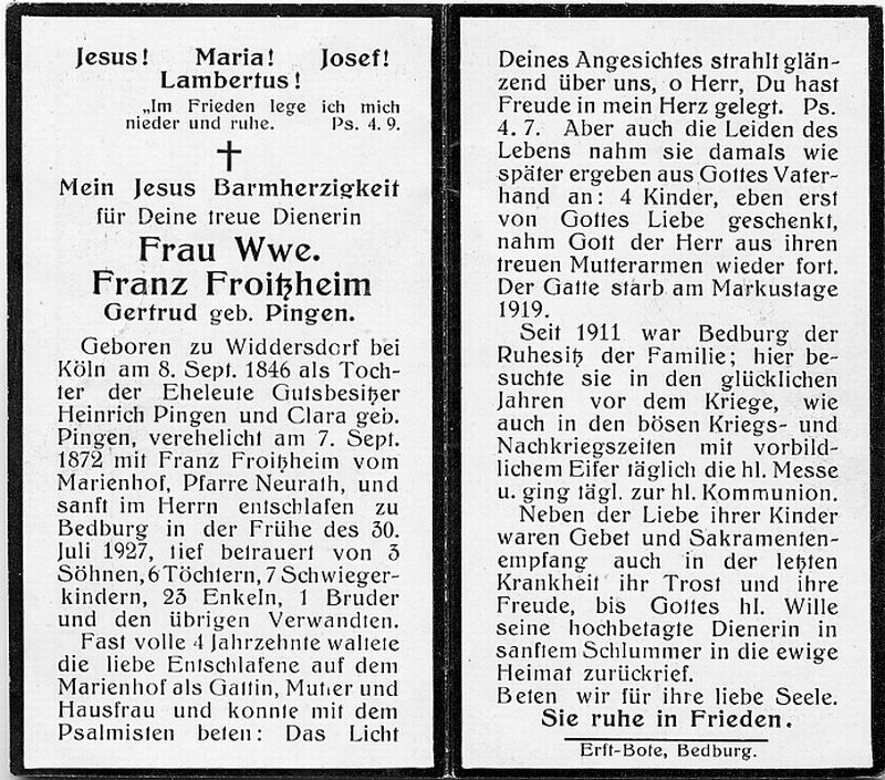 Eltern: Gutsbesitzer Heinrich Pingen u. Clara geb. Pingen; ∞ 7.9.1872 Franz Froitzheim vom Marienhof, Pfarre Neurath, † 25.4.1919; 13 K., davon 4 früh †; fast 40 J. auf dem Marienhof; seit 1911 Ruhesitz in Bedburg |