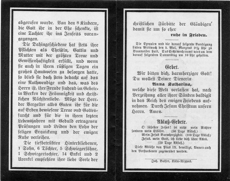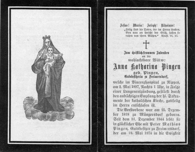 Gutsbesitzerin zu Freimersdorf; ∞ 31.12.1844 Peter Mathias Pingen, Gutsbesitzer in Freimersdorf, † 18.5.1874; 8 K., davon 1 †; ; in den letzten Lebensjahren Prüfungen und Leiden |