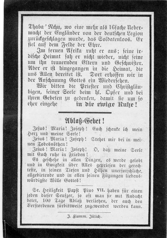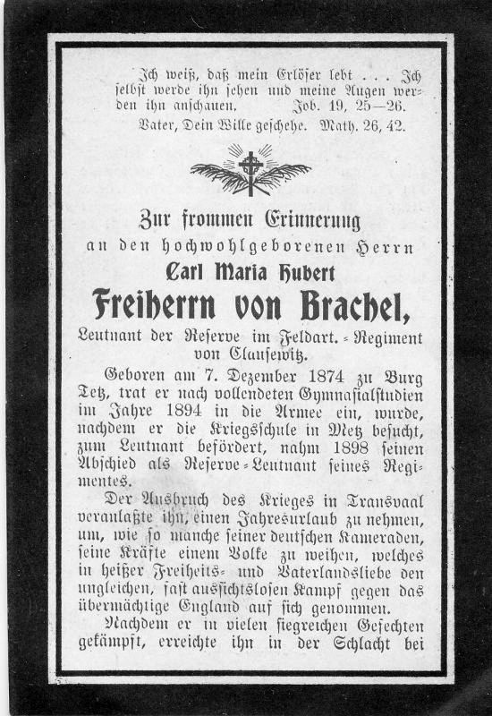 Gefallener im Burenkrieg 1899-1902; 1894 Eintritt in Armee; Leutnant; 1898 Abschied als Reserveleutnant; bei Ausbruch des Krieges in Transvaal nahme er Jahresurlaub, um Freiheitskamp der Buren zu unterstützen; gefallen in Schlacht bei Thaba Nchu |