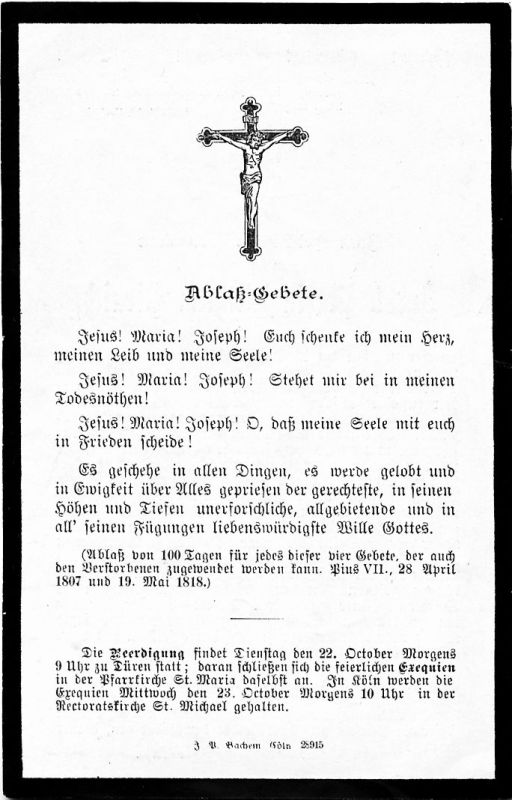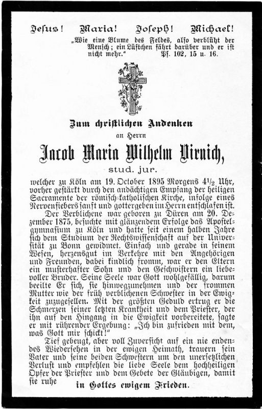 Abitur Apostelngymnaslium Köln; Studium der Rechtswissenschaft in Bonn; Tod infolge eines Nervenfiebers; Exequien in Düren und Köln (St. Michael); Beerdigung in Düren |