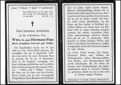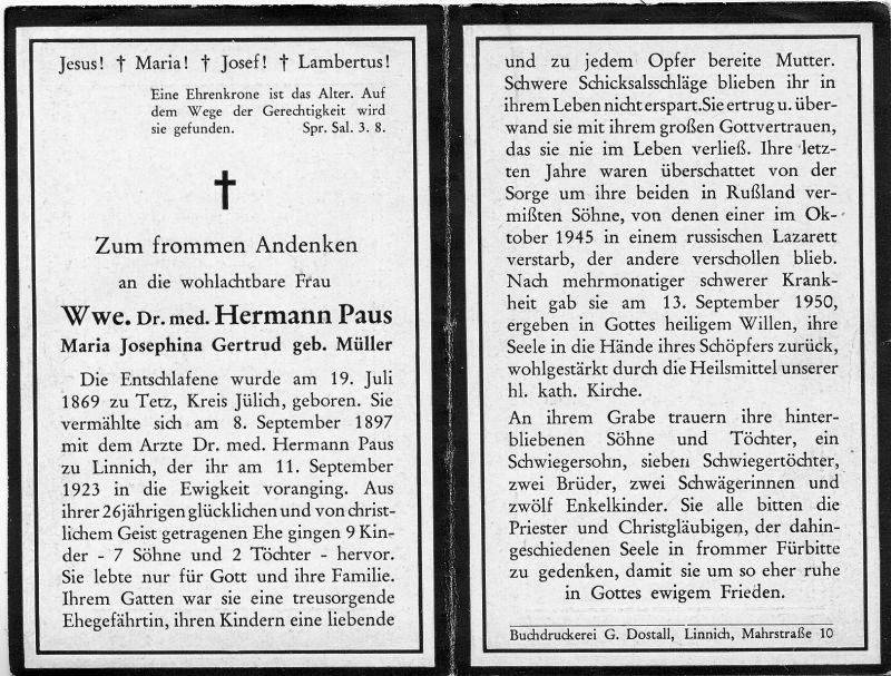 ∞ 8.9.1897 Dr. med. Hermann Paus zu Linnich, † 11.9.1923; 9 K.; 1 Sohn im 2. Weltkrieg Okt. 1945 in russ. Lazarett †; 1 Sohn in Rußland vermißt; monatelange schwere Krankheit |