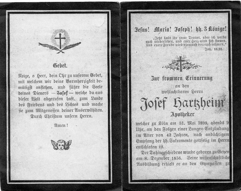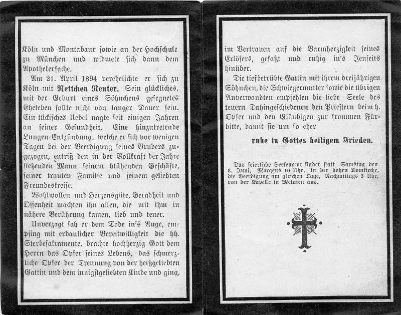 42 J., Lungenentzündung, die er sich bei der Beerdigung des Bruders zuzog; Apotheker; Gymnasium in Köln u. Montabaur; Hochschüle München; ∞ 21.4.1894 Nettchen Reuter; 1 Sohn; Melatenfriedhof |