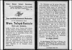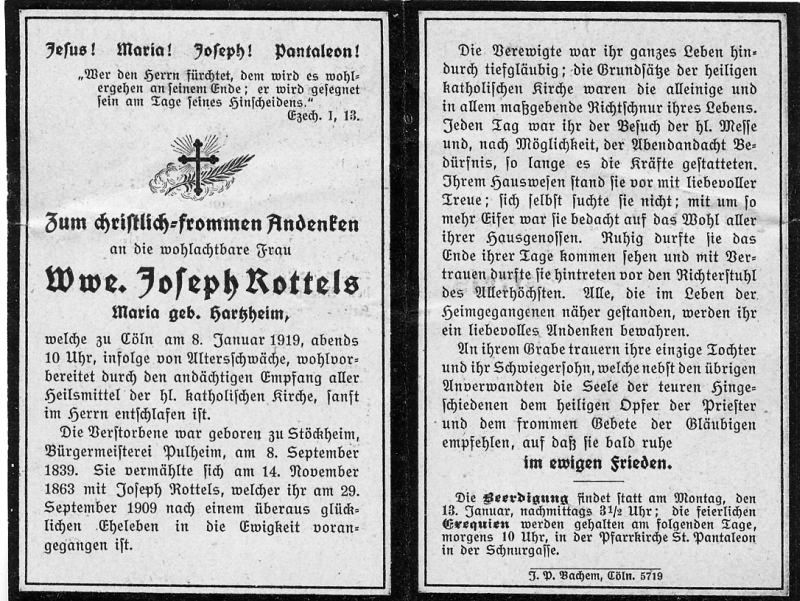 Altersschwäche; ∞ 14.11.1863 Joseph Rottels, † 29.9.1909; 1 überlebende Tochter; Exequien in St. Pantaleon |