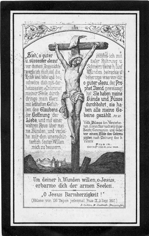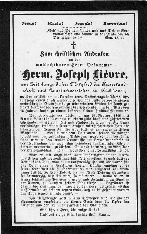 75 J.; Eltern: Paul Lièvre u. Anna Maria geb. Nießen; mehrjähriges Siechtum nach wiederholten Schlaganfällen; lange Jahre Mitgl. Kreisstandschaft u. Gemeindevorsteher zu Kückhoven; ∞ 24.2.1846 Anna Sibylla Gerats, *5.8.1819 Kückhoven, † 11.10.1888 Kückhoven, Tochter von Peter Gerats u. Maria Helena geb. Jopen; Ökonom, großer wirtschaftl. Betrieb |