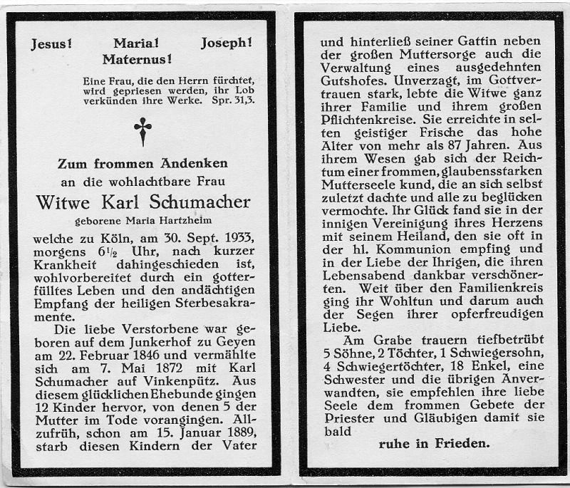 ∞ 7.5.1872 Karl Schumacher auf Vinkenpütz, † 15.1.1889; 12 K., davon 5 †; nach Tod des Mannes verwaltete sie das Gut; |
