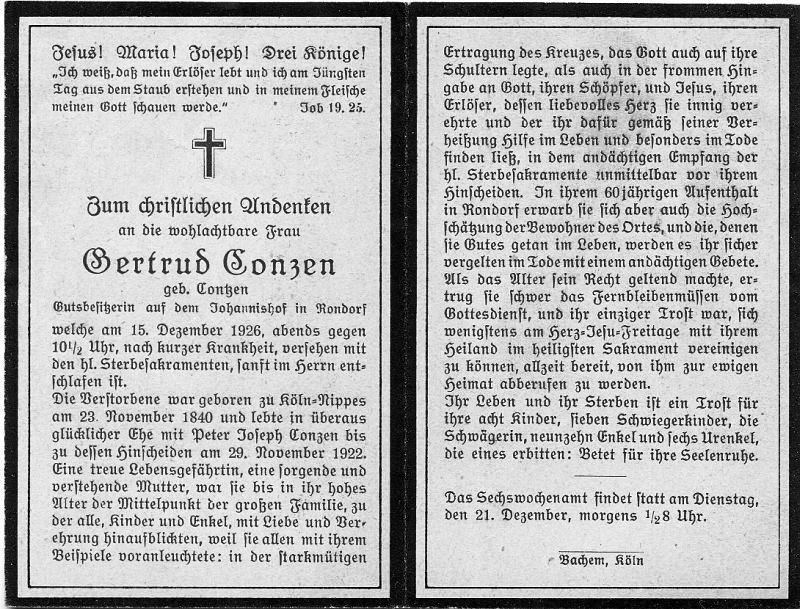 Gutsbesitzerin auf dem Johannishof in Rondorf; ∞ Peter Joseph Conzen, † 29.11.1922; 60 J. lebte sie in Rondorf; 8 überlebende Kinder |