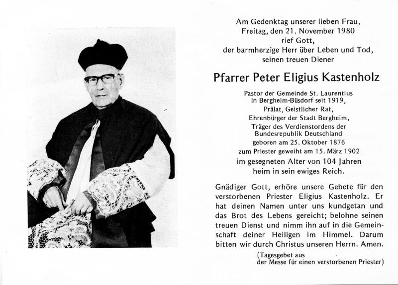 104 J.; Priesterweihe 15.3.1902; Pfarrer der Gemeinde St. Laurentius in Bergheim-Büsdorf |