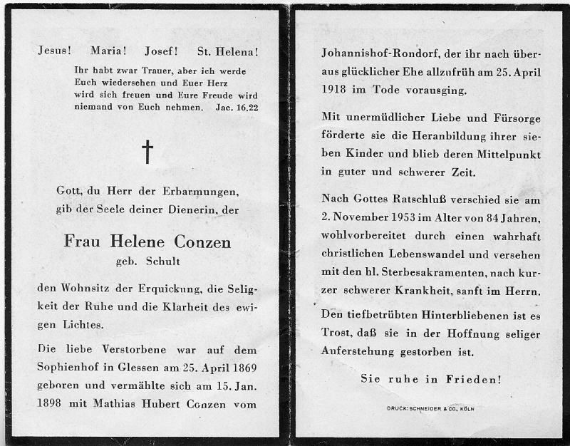 ∞ 15.1.1898 Mathias Hubert Conzen vom Johannishof in Rondorf, † 25.4.1918; 7 K. |