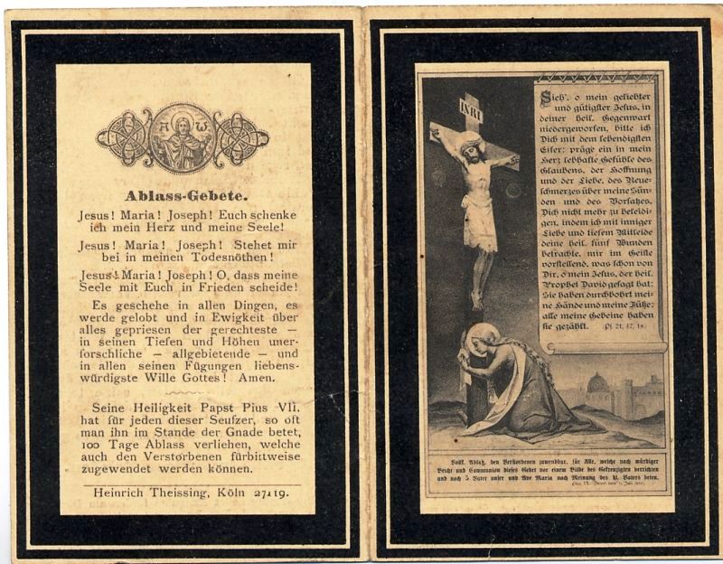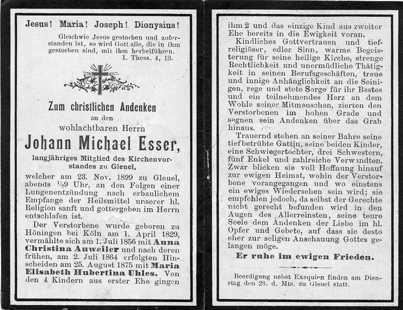 Lungenentzündung: langjähr. Mitgl. d. Kirchenvorstandes zu Gleuel; ∞ 1.7.1856 Anna Christina Auweiler, † 2.6.1864; 4 K., davon 2 † ∞ 25.8.1875 Maria Elisabeth Hubertina Uhles; 1 K., † |