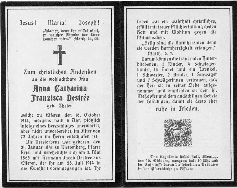 Herzschlag; ∞ 11.5.1865 Hermann Jacob Destrée aus Efferen, † 28.7.1914; 5 überlebende Kinder |