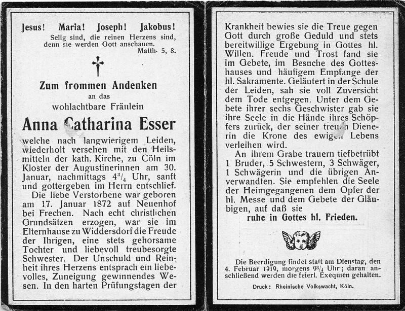 Fräulein; langwieriges Leiden; Elternhaus zu Widdersdorf; Beerdigung in Widdersdorf |
