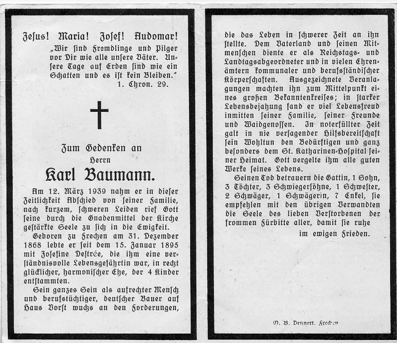 Kurzes, schweres Leiden; ∞ 15.1.1895 Josefine Destrée; 4 K.; deutscher Bauer auf Haus Vorst; Reichstags- u. Landtagsabgeordneter; Wohltäter des St.-Katharinen-Hospitals in Frechen; 4 überlebende Kinder |