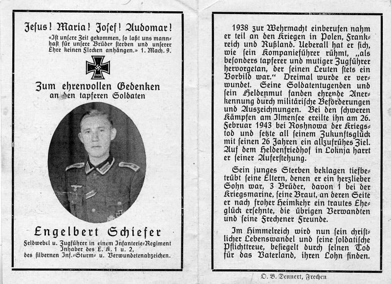 Gefallenr 2. Weltkrieg; 26 J.; 1938 zur Wehrmacht einberufen; dreimal verwundet; Heldenfriedhof in Loknja; 1 Bruder bei der Kriegsmarine; verlobt (Frechen) |