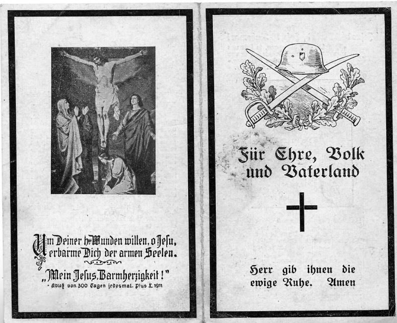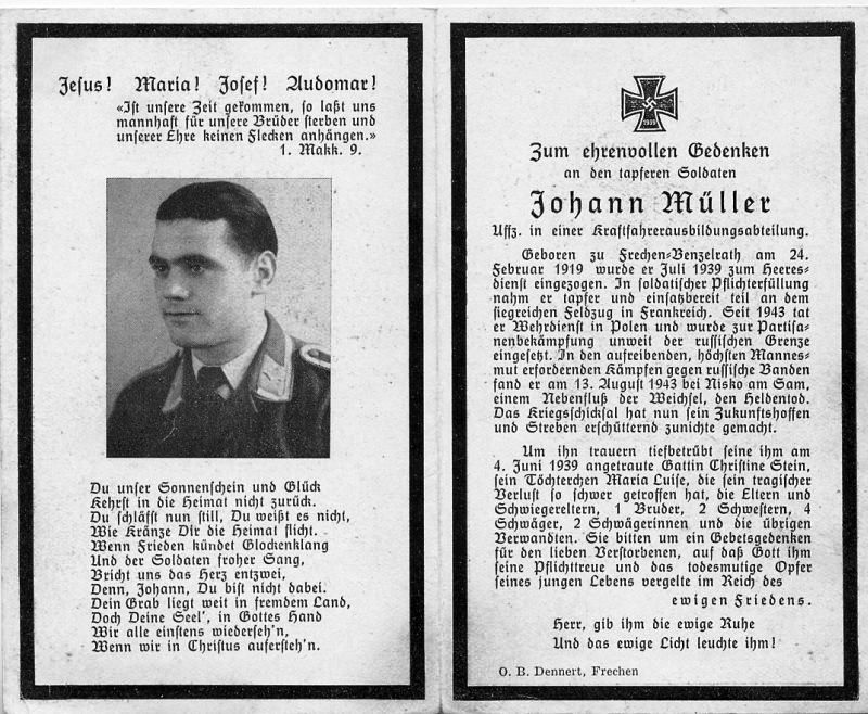 Gefallener 2. Weltkrieg; zur Partisanenbekämpfung unweit der russischen Grenze eingesetzt; ∞ 4.6.1939 Christine Stein; Tochter Maria Luise |