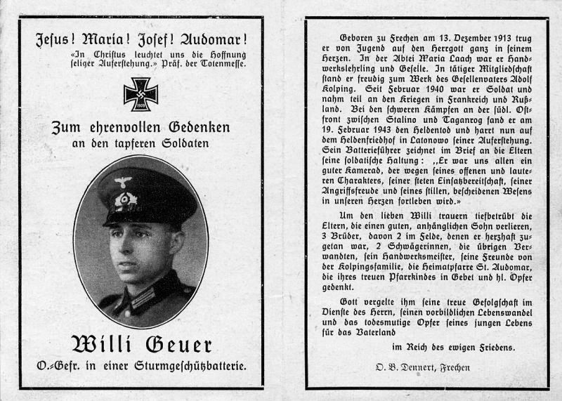 Gefallener 2. Weltkrieg; Handwerkslehrling u. Geselle in der Abtei Maria Laach; Mitgl. Kolpingfamilie; Heldenfriedhof in Latonowo; 2 Brüder im Felde |