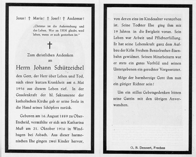 ∞ 21.10.1916 Katharina Muß in Windhagen b. Asbach; 2 K., davon 1 früh †; Tochter Else mit 19 J. †; beschäftigt b.Köln-Frechen-Benzelrather Eisenbahn (Frechen) |