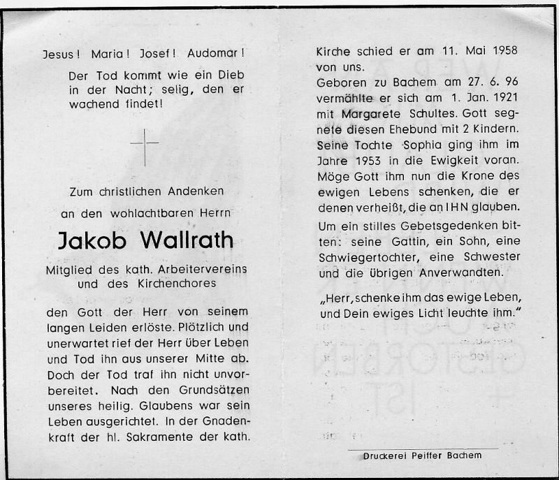 Mitgl. Kath. Arbeiterverein u. Kirchenchor Frechen-Bachem; ∞ 1.1.1921 Margarete Schultes; 2 K.; Tochter Sophia † 1953 |