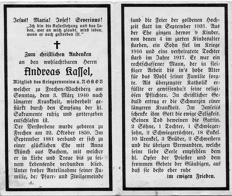 Mitgl. Kriegerverein u. NSKOV; ∞ Sept. 1881 Anna Münch aus Bachem; 9 K., davon 4 früh † ; 1931 Goldhochzeit; 1 Sohn 1916 im 1. Weltkrieg gefallen; eine verh. Tochter † 1917; |