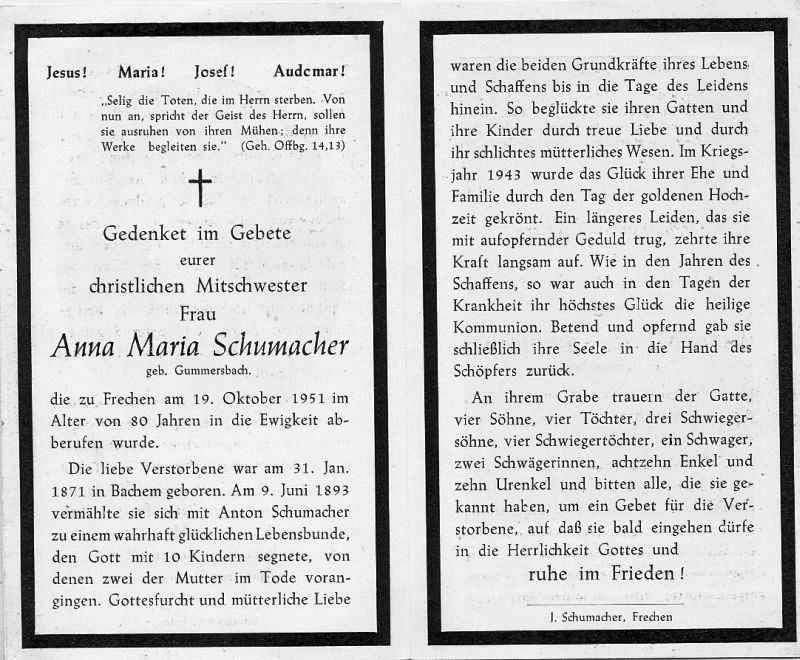 ∞ 9.6.1893 Anton Schumacher; 10 K., davon 2 †; 1943 Goldhochzeit; längeres Leiden |