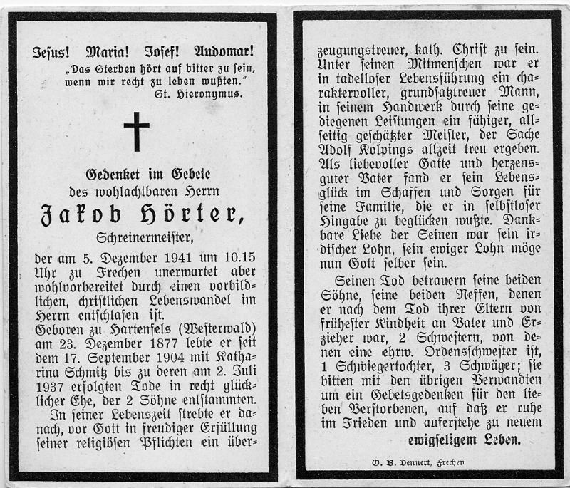 Schreinermeister; ∞ 17.9.1904 Katharina Schmitz, † 2.7.1937; 2 Söhne; Mitgl. Kolpingfamilie |