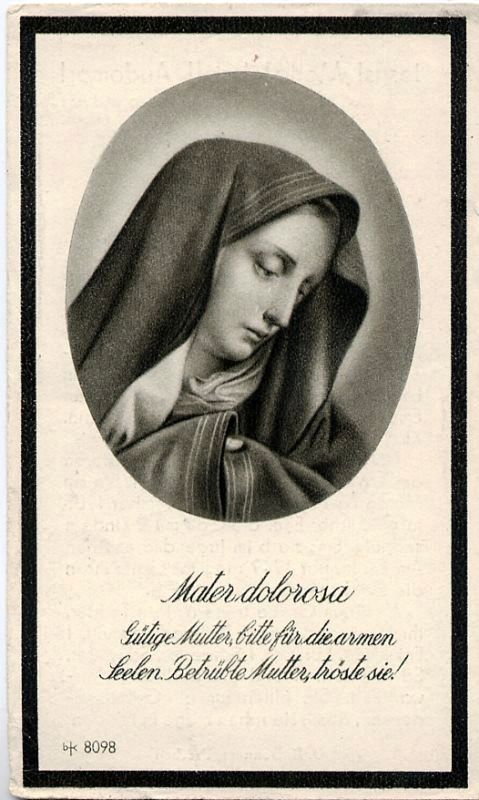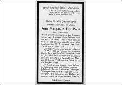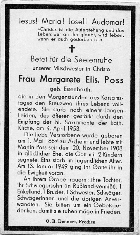 ∞ 20.11.1908 Martin Poss, † 13.1.1949; 2 K., davon 1 jugendl. †; Schwiegersohn in Rußland vermißt (2. Weltkrieg) |