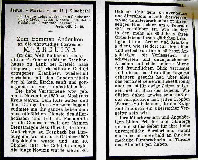 M. Arduina, Sr., geb. Hens | Vorname: |