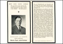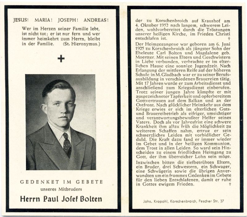Seit 1 J. schweres Leiden; Eltern: Carl Bolten u. Magdalene geb. Moertter; Höhere Schule in Mönchengladbach, Ausbildg. in mehreren Brauereien; Kriegsdienst |